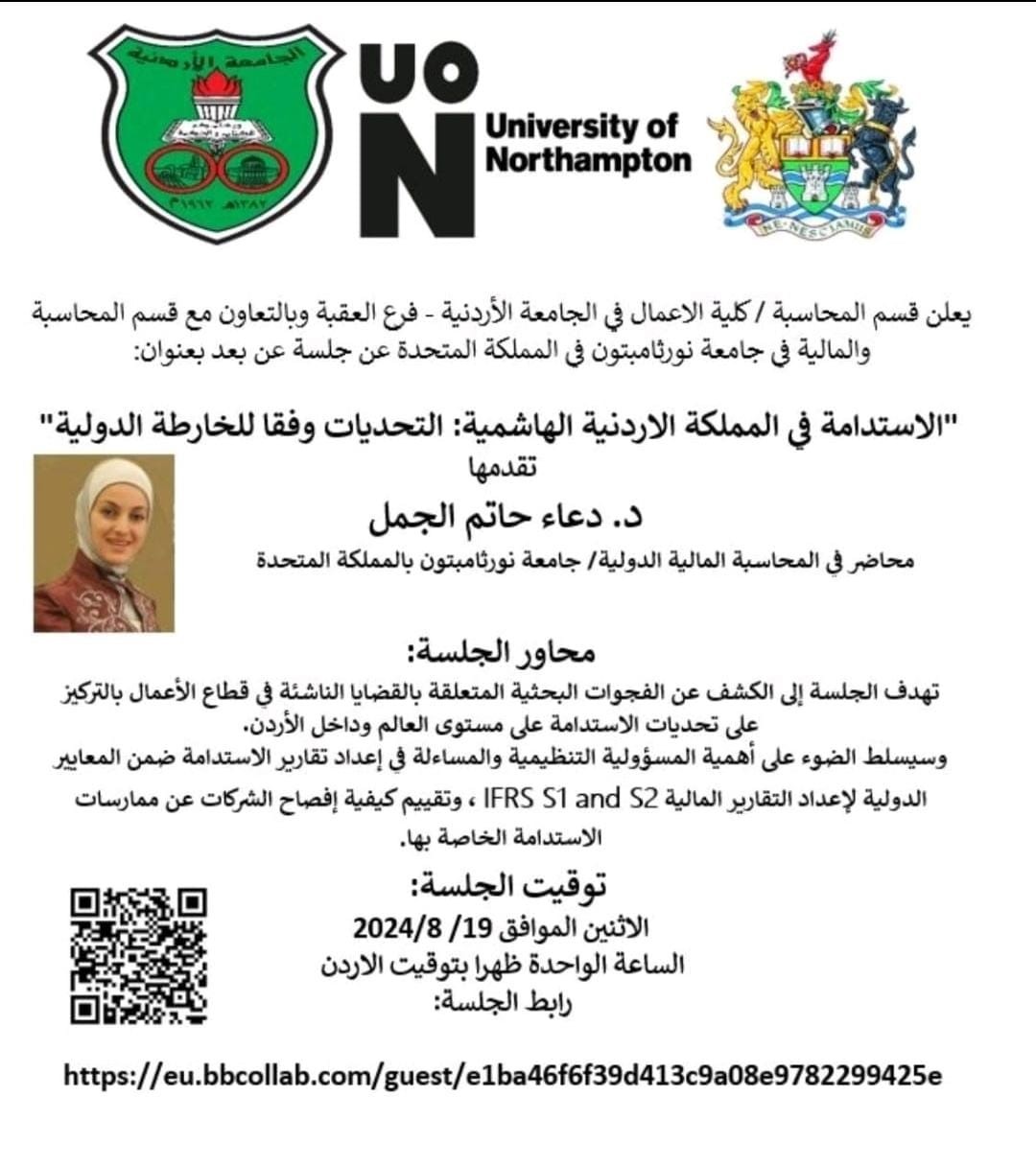 The Department of Accounting at the University of Jordan Aqaba hosts a session on sustainability in Jordan presented by Dr. Doaa Al-Jamal