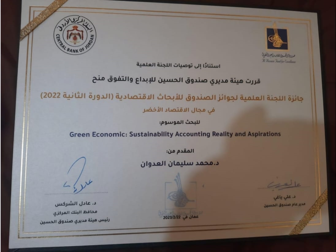 1. Dr. Mohammad Adwan was awarded the Prince Hussain Fund Award in 2023 for his research on Green Economics, focusing on 'accounting reality and inspirations'.