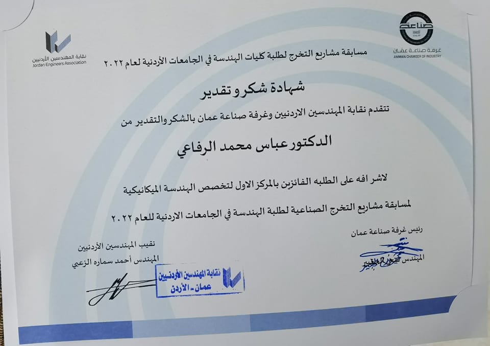 المرتبة الأولى للمشاريع المنفذة في القطاع الصناعي / شعبة الهندسة الميكانيكية على مستوى الجامعات الاردنية لعام 2018..