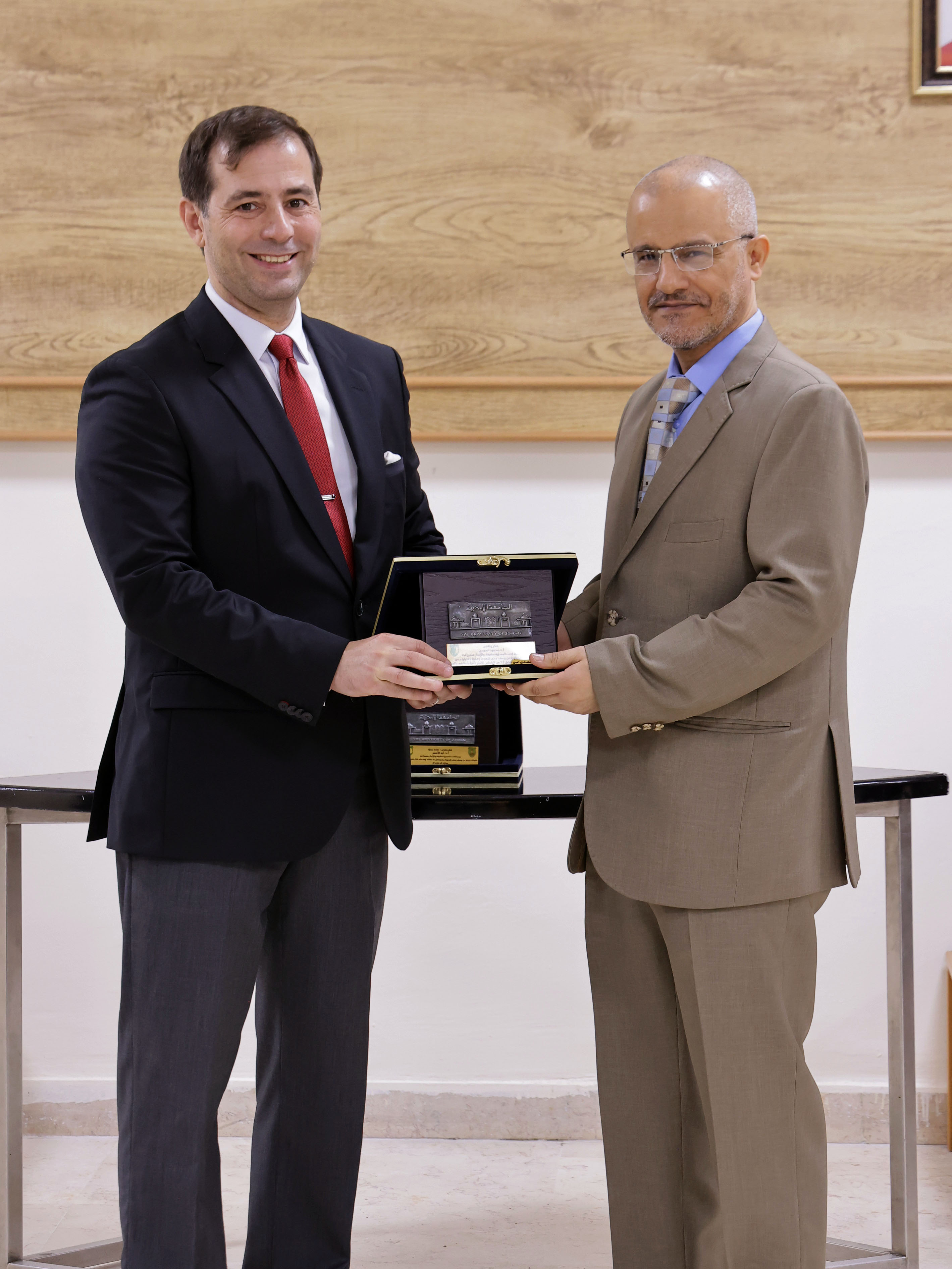 Prof. Mahmoud K. Al-Omiri receives a trophy from Prof. Zaid Al-Bitar, Dean of the School of Dentistry, University of Jordan, in recognition of his inclusion among the world’s top 2% scientists.