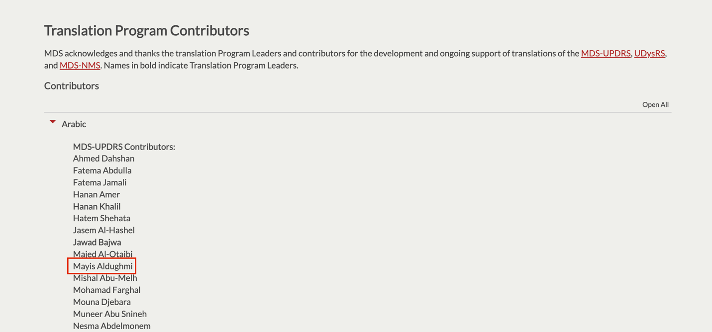 Dr. Mayis Aldughmi is an active member in the Movement Disorders Society (MDS) Arabic tranlation program of outcome measures.