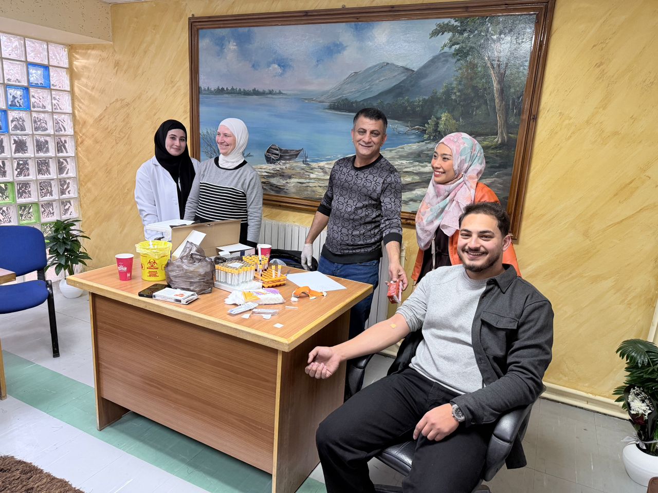A moment captured during blood sample collection as part of the ongoing research project at the School of Sport Sciences, University of Jordan. Prof. Dr. Manal M. Bayyat and Dr. Nurwina Anwar are shown overseeing the procedure in accordance with the study’s research protocol.