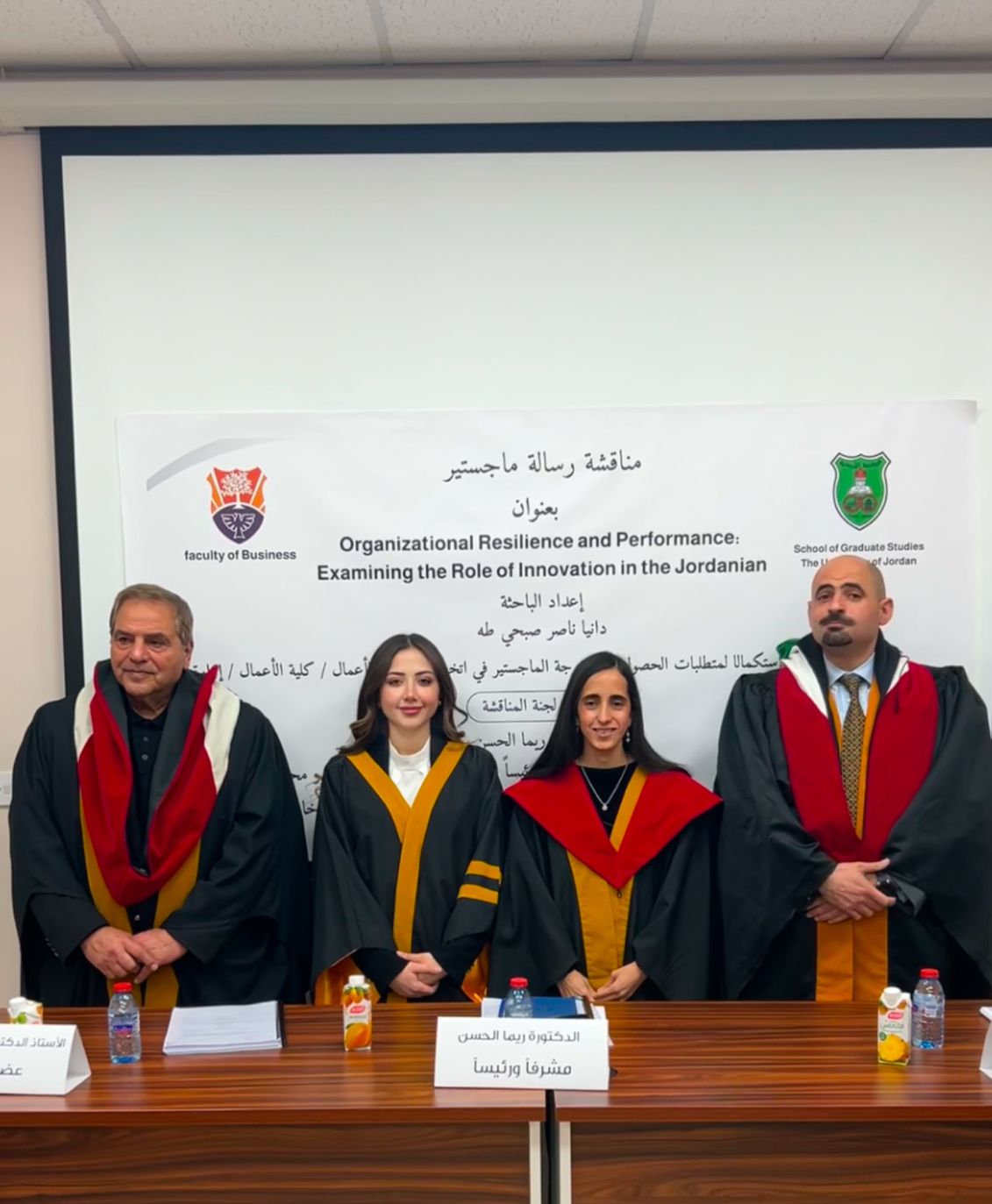 Ms. Dania Taha, successfully defended her MBA thesis on the 12th of January, 2025 titled: "Organizational Resilience and Performance: Examining the Role of Innovation in the Jordanian Banking Sector" supervised by Dr. Rima Al Hasan