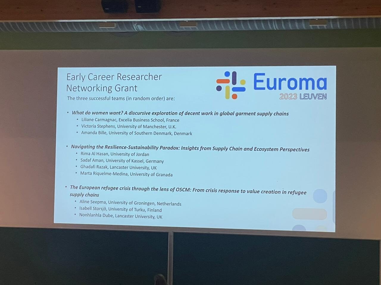 The research group received the Early Career Research Networking grant from the European Operations Management Association (EurOMA) for its research entitled "Navigating the Resilience-Sustainability Paradox: Insights from Supply Chain and Ecosystem Perspectives". EurOMA is an international network of academics and practitioners from around the world who have a common interest in the continuing development of Operations Management. EurOMA is a European-based network with rapidly growing international links, whereby members can share their ideas, knowledge, and experience. It is a communication network that bridges the gap between research and practice.