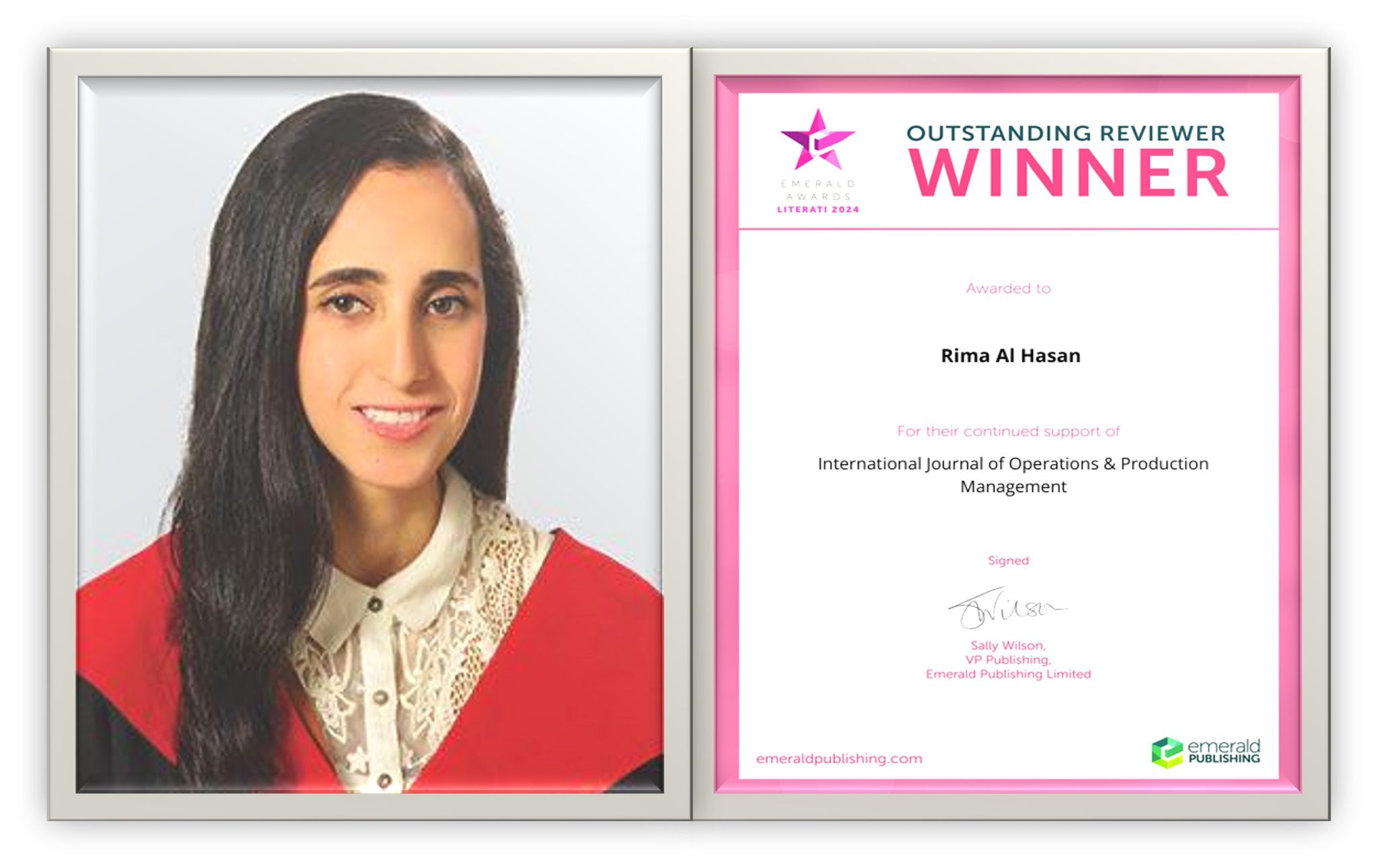 Dr. Rima Al Hasan received the Emerald Literati Award: Outstanding Reviewer in 2024 from the International Journal of Production and Operations Management (Scopus Q1, ABS 4 journal)