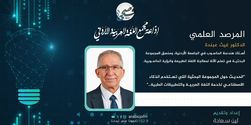 On June 11th, Prof. Gheith Abandah, coordinator of the Machine Learning, Natural Language Processing (NLP), and Computer Vision Research Group, was featured in a special interview on the Jordanian Academy of Arabic Language Radio ( إذاعة مجمع اللغة العربية الأردني). Listen to the full interview here: Watch on Facebook.