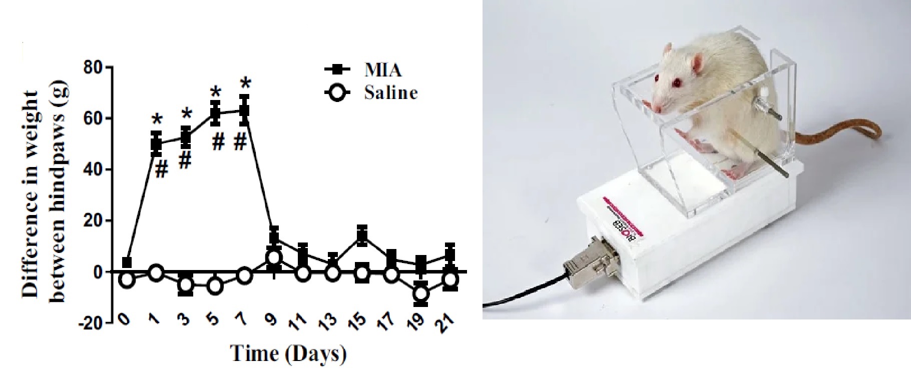 Effects of intra-articular injection of Monoiodoacetate (MIA) on weight-bearing difference between the two hind paws. Weight-bearing difference was significantly increased in MIA-treated rats compared to vehicle-treated rats.