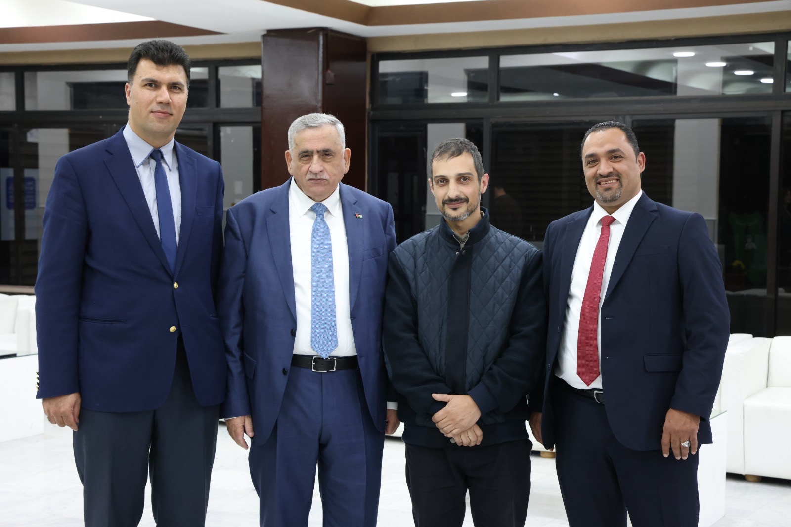 A group photo taken after an honorary PhD ceremony at the University of Jordan. The university president, along with three faculty members, is seen standing together