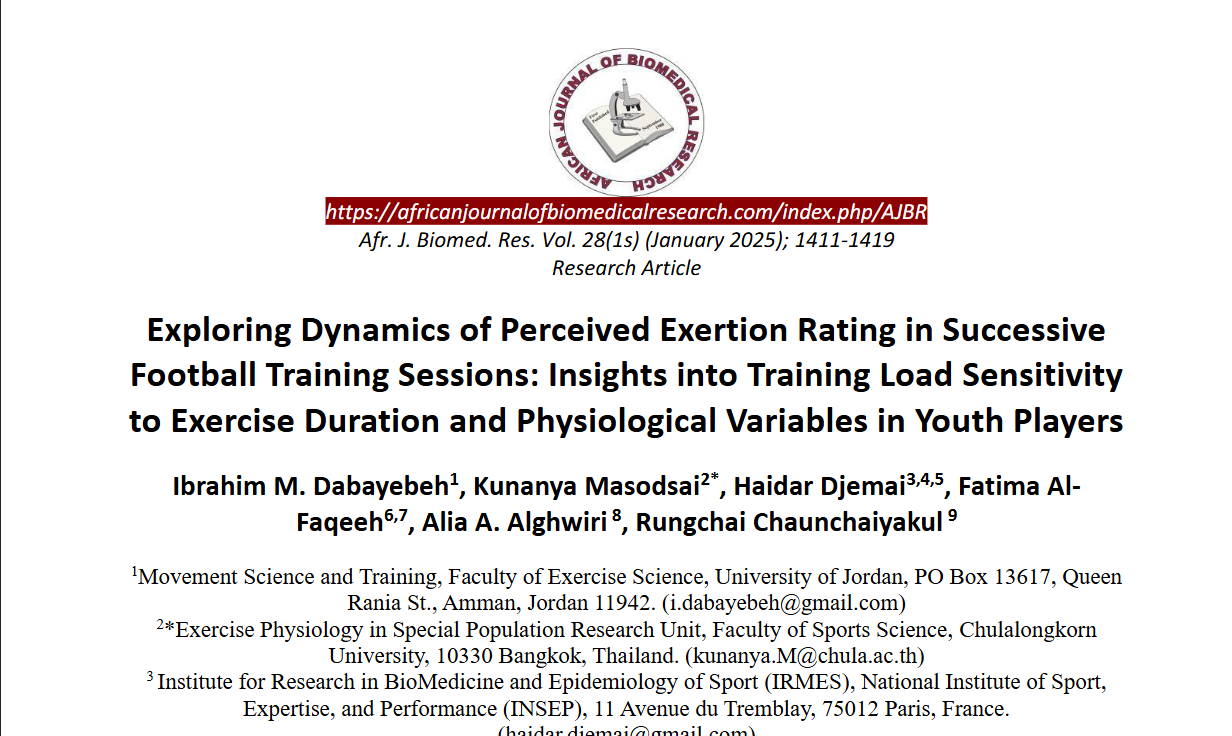 A recent study titled "Exploring Dynamics of Perceived Exertion Rating in Successive Football Training Sessions: Insights into Training Load Sensitivity to Exercise Duration and Physiological Variables in Youth Players" delves into how perceived exertion (RPE) evolves across consecutive football training sessions, particularly among youth athletes. The research highlights that RPE is not solely influenced by external load but is also significantly affected by factors such as session duration, physiological markers, and individual player responses. African Journal of Biomedical Research+1PubMed+1