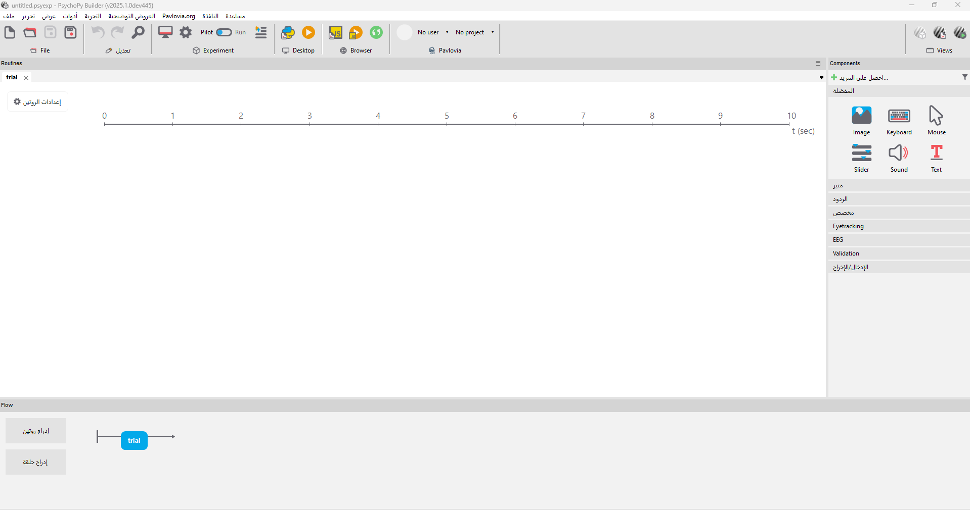 Our research group has pioneered the creation of the first Arabic version of PsychoPy (2025.1.0), a leading open-source tool for psychological experiments. This adaptation aims to enhance accessibility for Arabic-speaking researchers and participants in behavioral studies. The software will soon be available for download at [https://www.psychopy.org/](https://www.psychopy.org/). Additionally, we support online experiment hosting through Pavlovia, an integrated platform for running and sharing studies remotely ([https://pavlovia.org/docs/experiments/overview](https://pavlovia.org/docs/experiments/overview)).