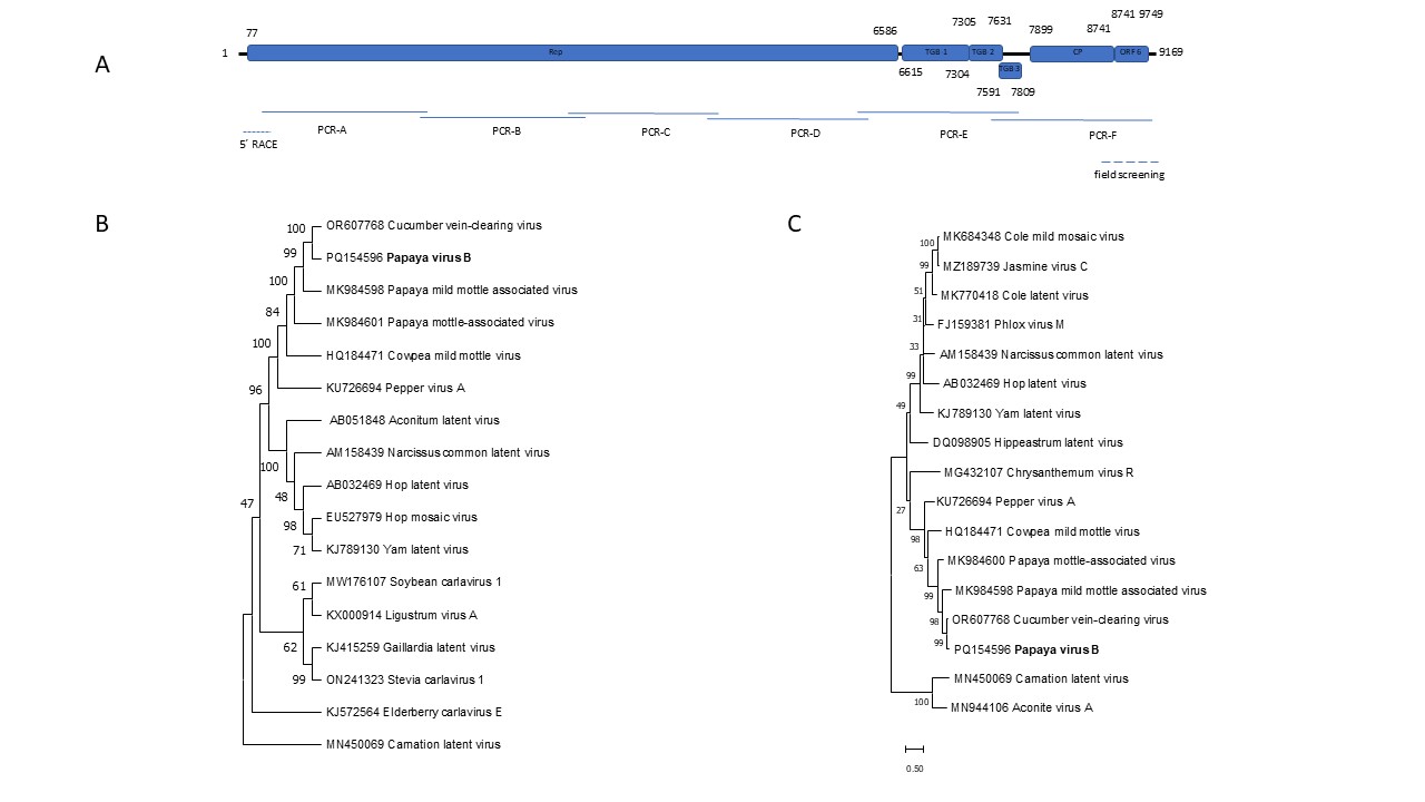 A novel carlavirus has been discovered in Carica papaya by high-throughput sequencing of a sample collected during field surveys in 2022 from Jordan Valley, Jordan. The complete genome sequence of 9169 nt was determined by RACE and verified by Sanger sequencing, and exhibited the typical organization of members of the genus Carlavirus, including a predicted ORF6. Alignment of coat protein and polymerase aa sequences revealed closest identity (~94% and ~69%, respectively) to a cucumber vein-clearing virus (CVCV) isolate. According to the ICTV demarcation criteria based on sequence alignment, the virus is a tentative new member of the genus Carlavirus, and the name “papaya virus B” is proposed. Following field surveys, the virus was detected in 20 out of 38 papaya samples with clear virus-like symptoms collected from 5 fields in Jordan, showing occurrence of infections with the novel carlavirus in different cultivated areas across Jordan Valley.