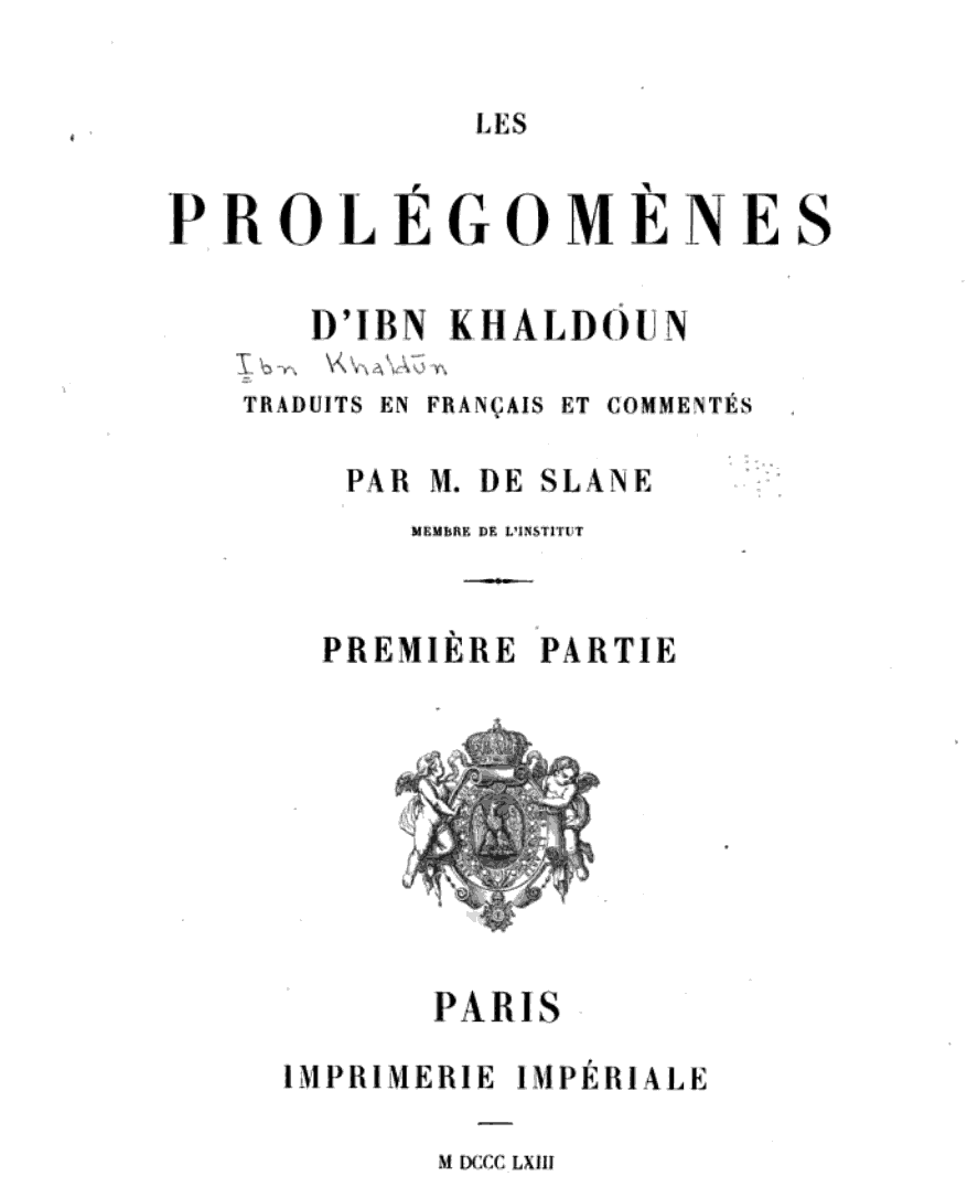 Also, the most important resource is Ibn Khaldun's own writing, particularly his magnum opus, the Kitāb al-ʻIbar ("Book of Lessons"). This is a universal history, and its detailed introduction, the Muqaddimah (Prolegomena), is the central text for anyone studying his theories.