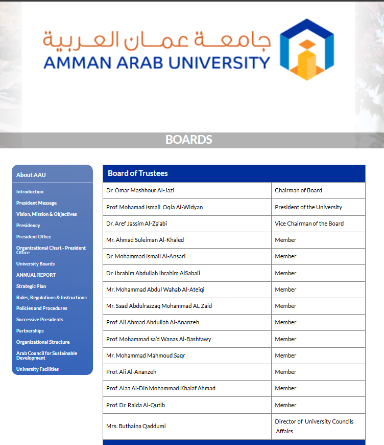 Based on the decision of the Higher Education Council, Professor Ali Alananzeh was appointed as a member of the Board of Trustees of Amman Arab University starting from 2/6/2022 for a period of four years.