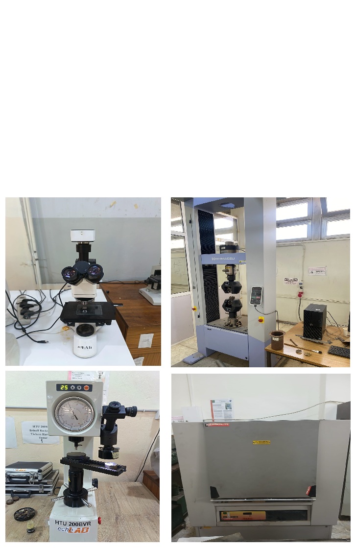 The laboratory is equipped with specialized tools for evaluating mechanical and thermal properties, including hardness testing stations (Rockwell, Brinell, and Vickers testers) for assessing surface resistance and durability. Universal Testing Machines (UTMs) with capacities up to 100 kN perform tensile, compression, and flexural tests to determine strength, elasticity, and ductility under controlled conditions. Additionally, multiple furnaces and heat treatment setups, such as muffle furnaces and controlled-atmosphere units reaching temperatures over 1400°C, facilitate processes like annealing, normalizing, hardening, and tempering, enabling studies on how thermal treatments influence material behavior and performance in industrial applications.